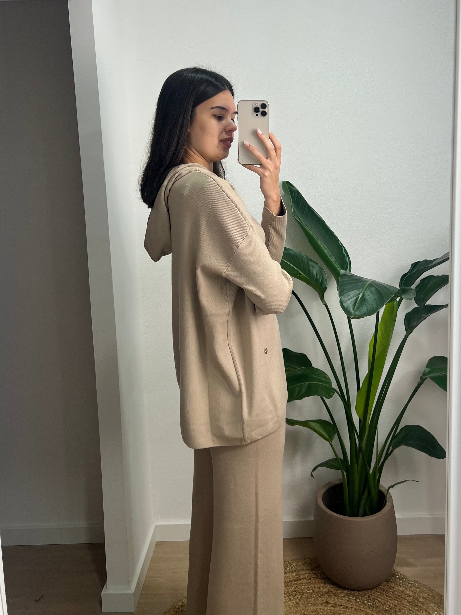 Conjunto de malha composto por camisola oversize com capuz e calça larga.