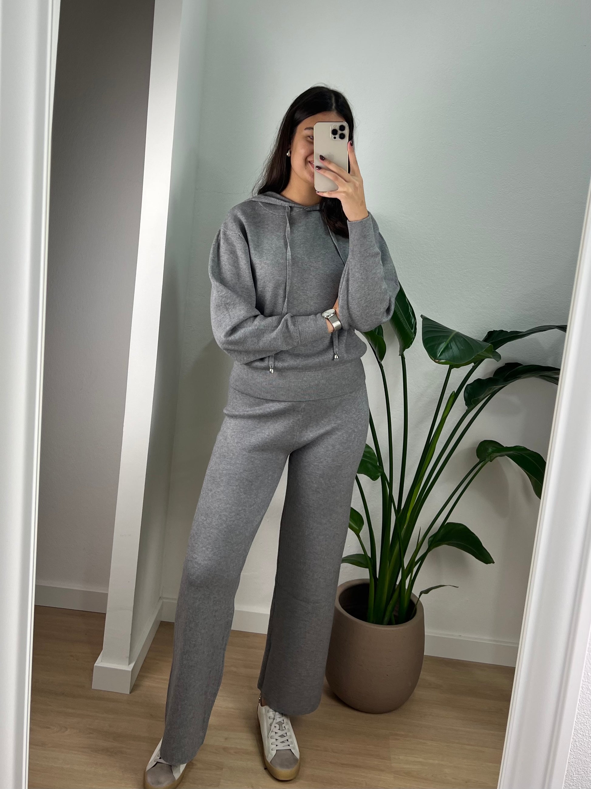 Conjunto de malha composto por camisola com capuz e calça larga.