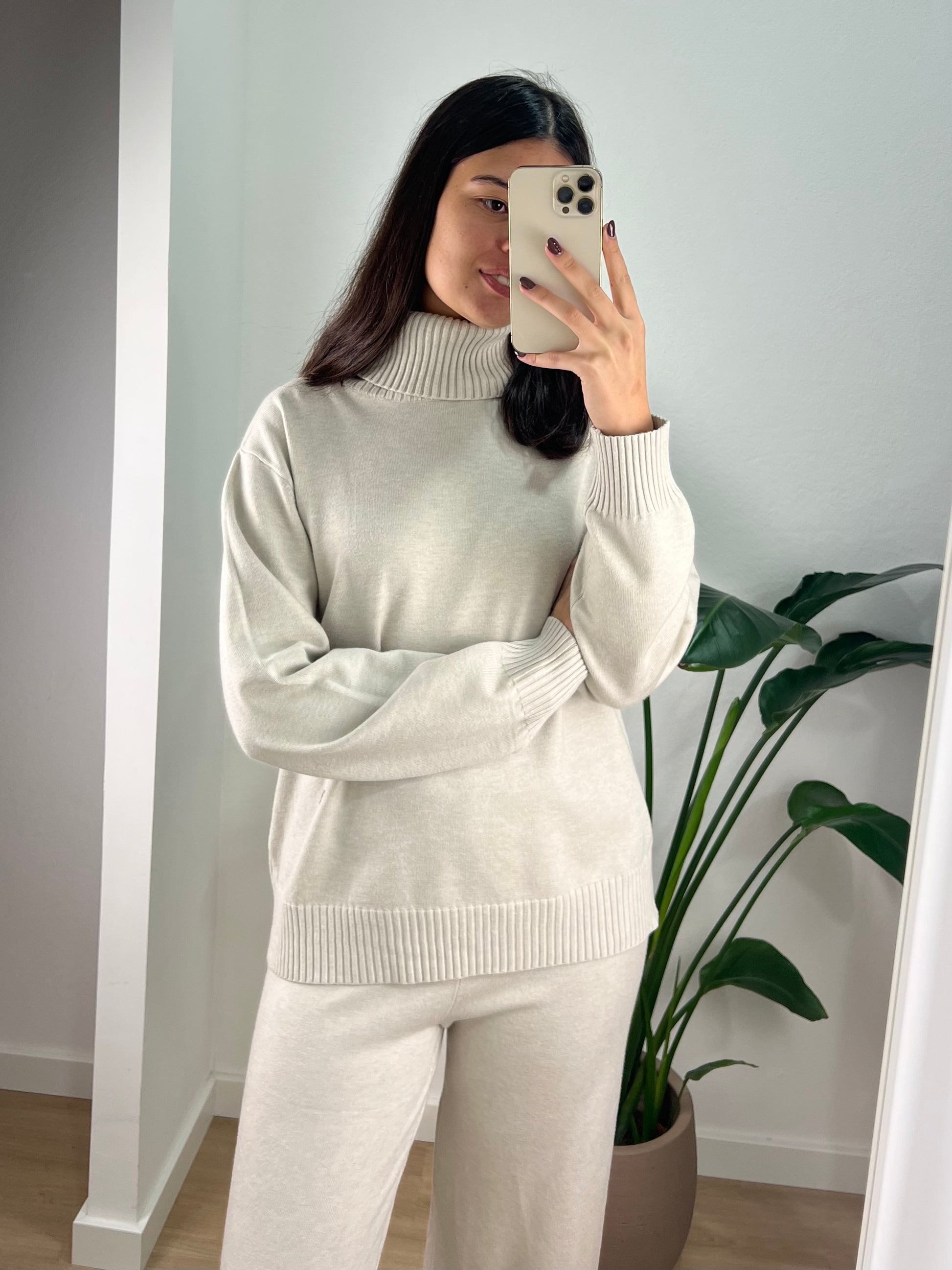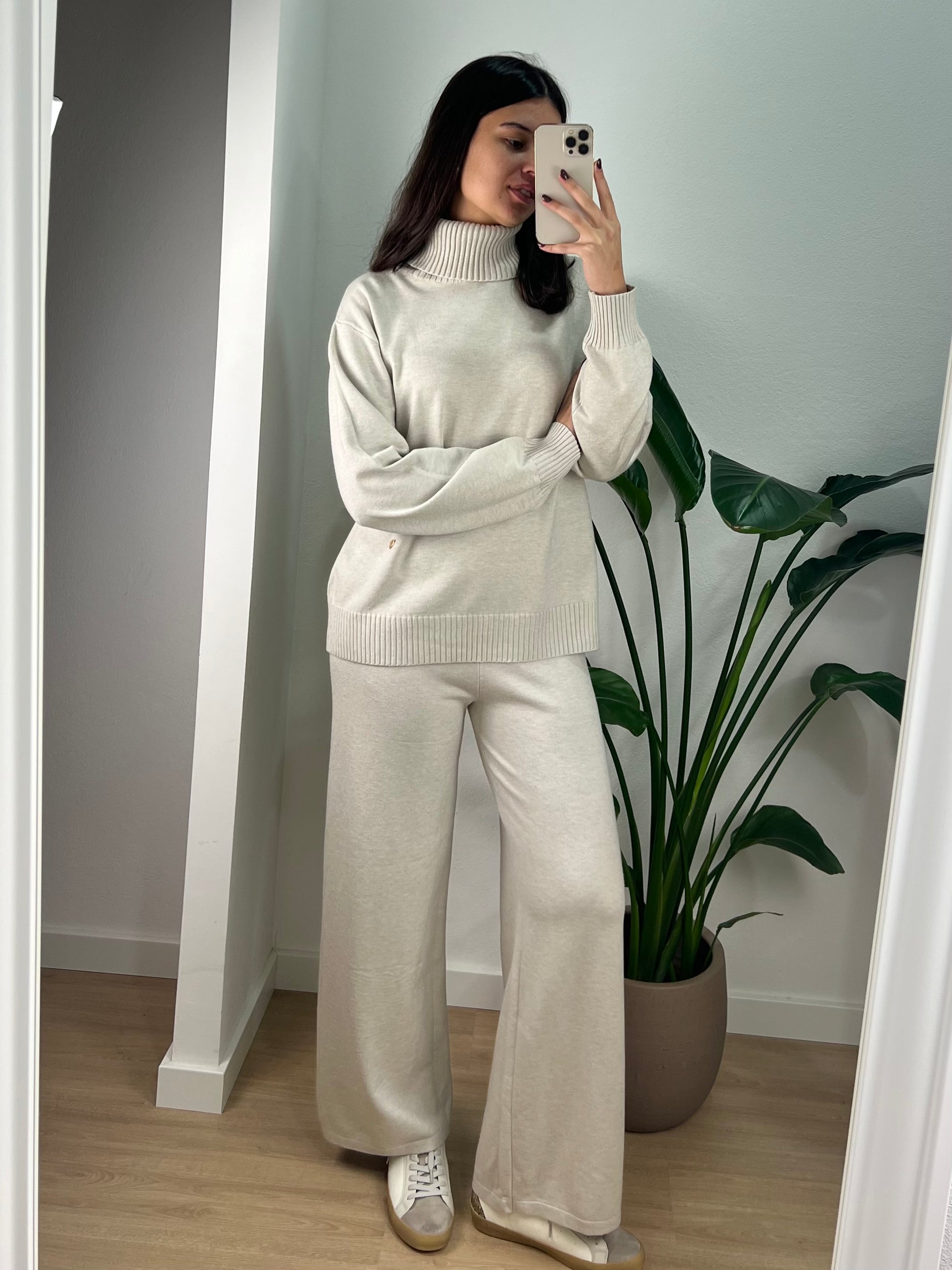 Conjunto de malha composto por camisola de gola alta e calça larga.