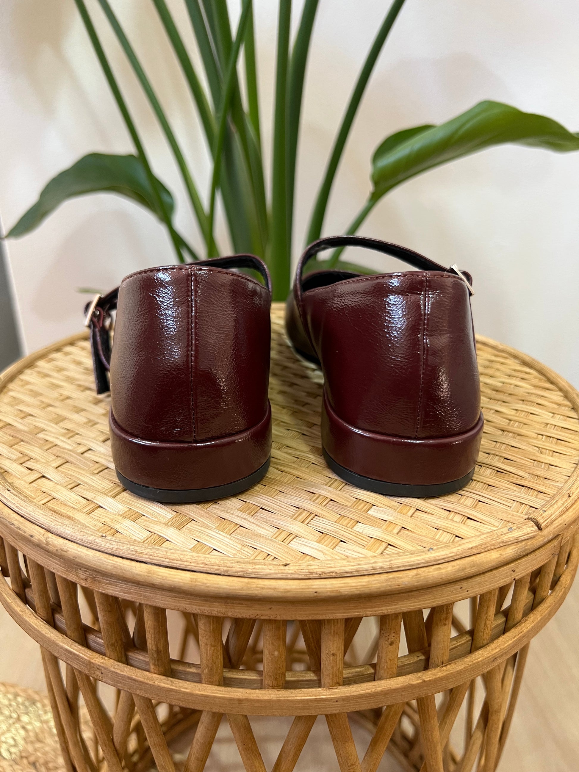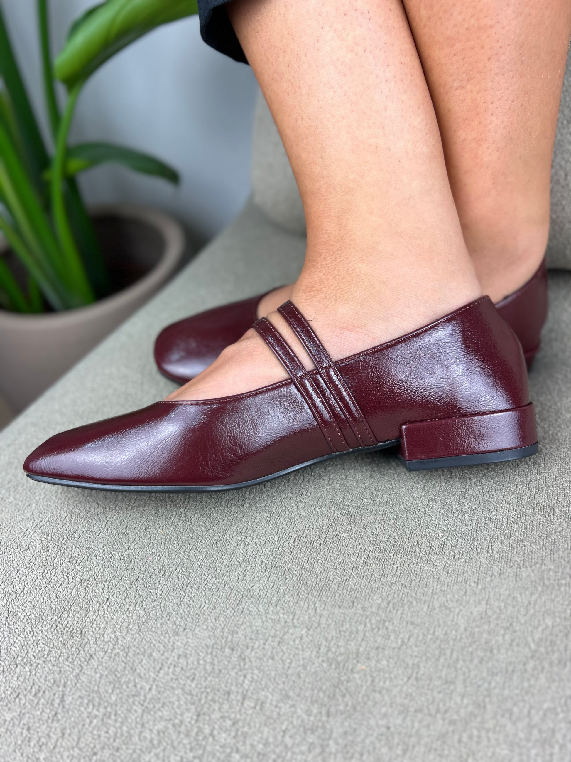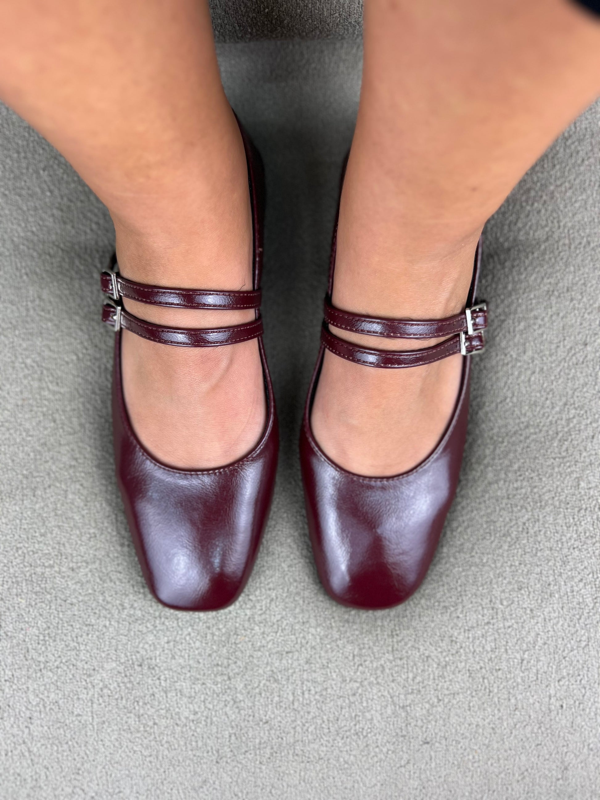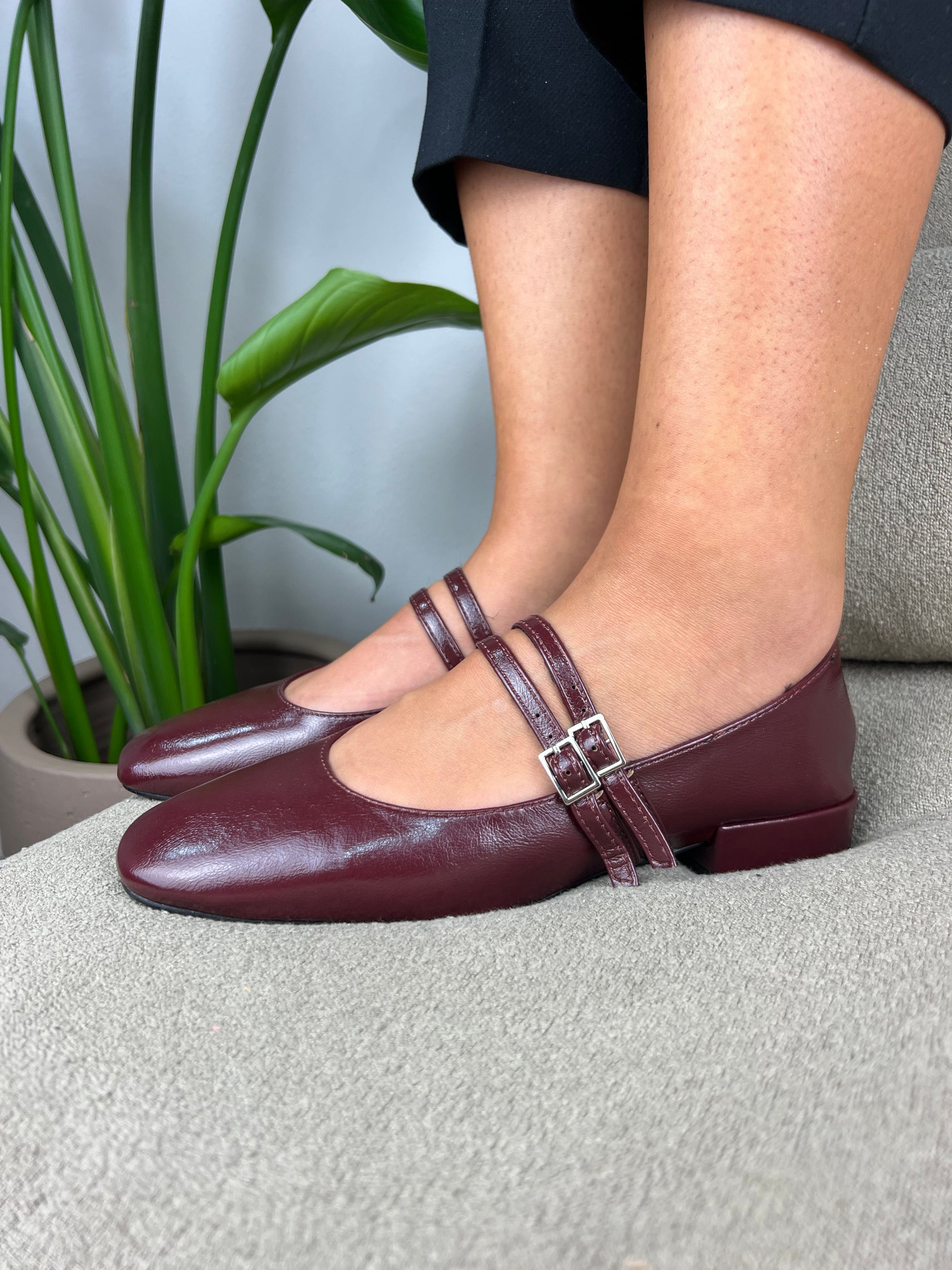 Mary Jane rasa com fivela dupla ajustável no peito do pé. Ponta ligeiramente quadrada. Palmilha almofadada.