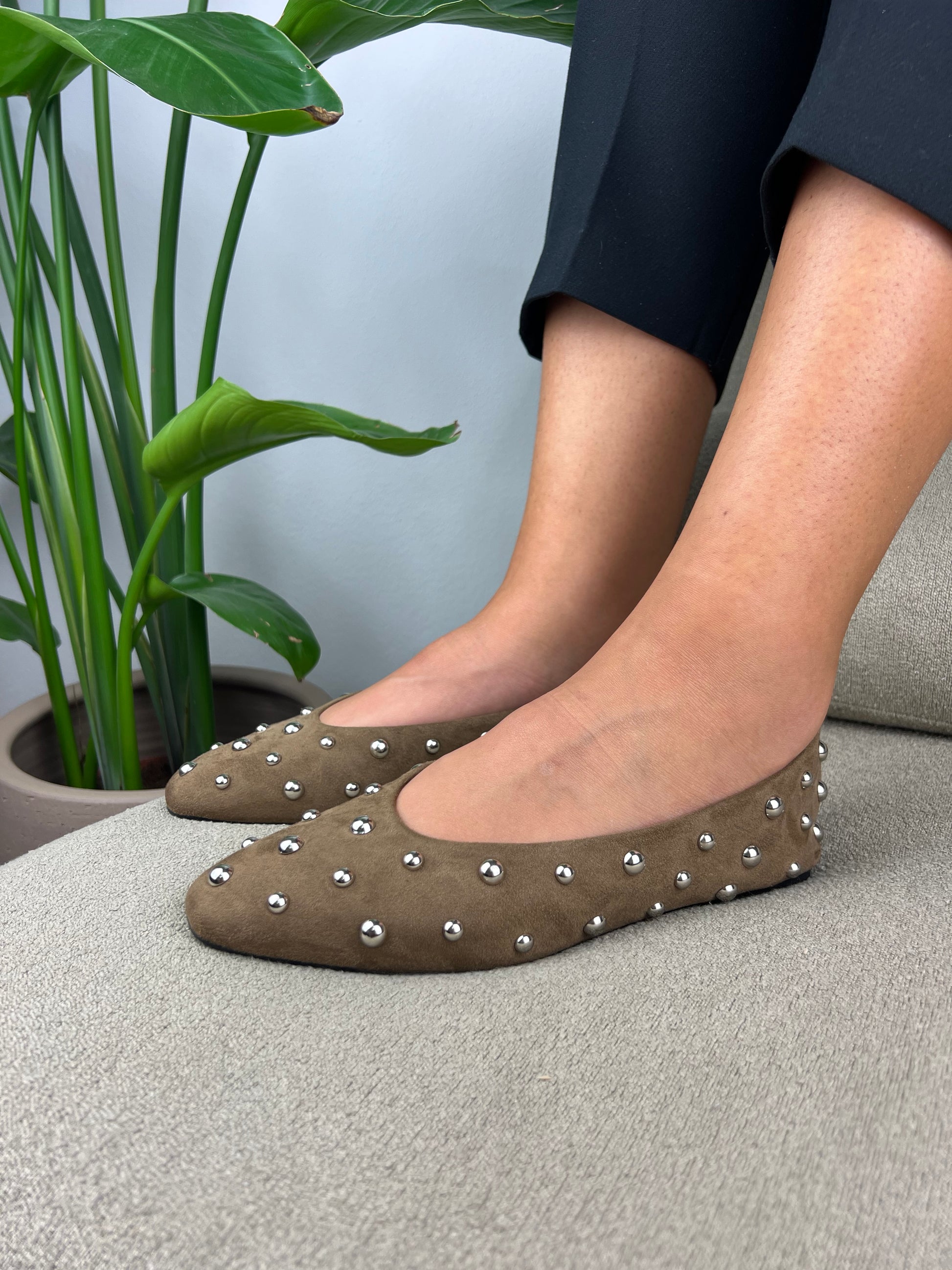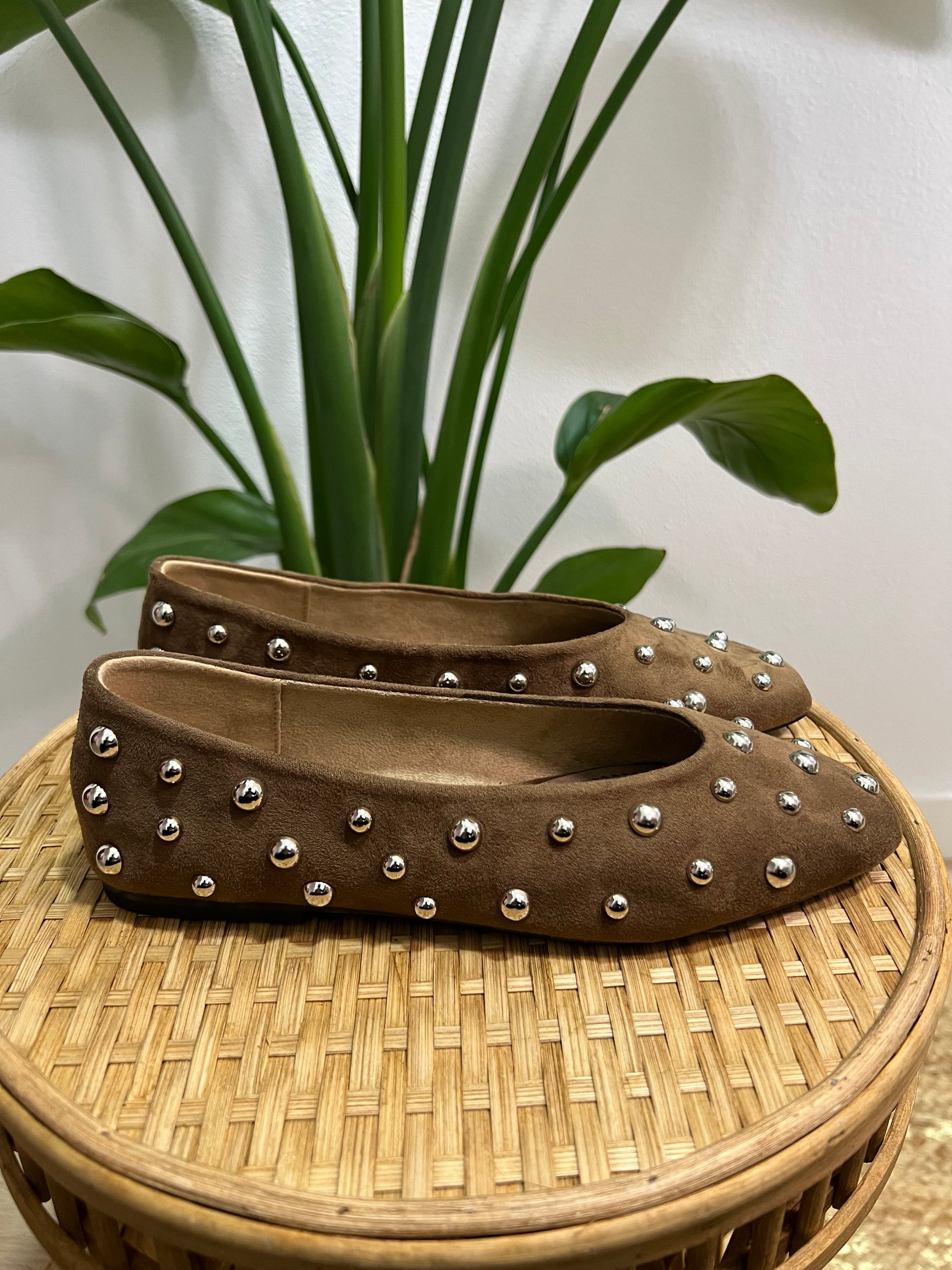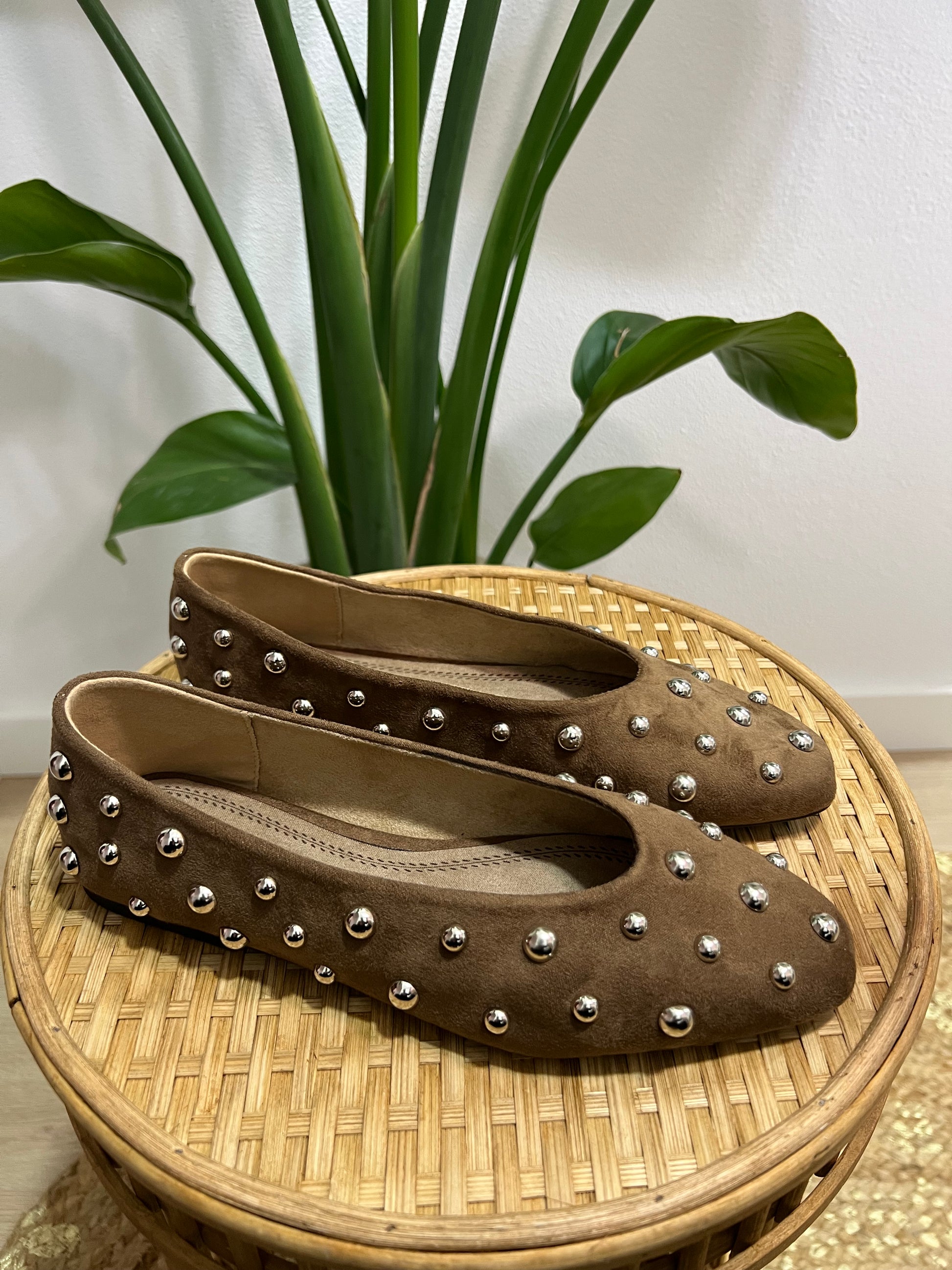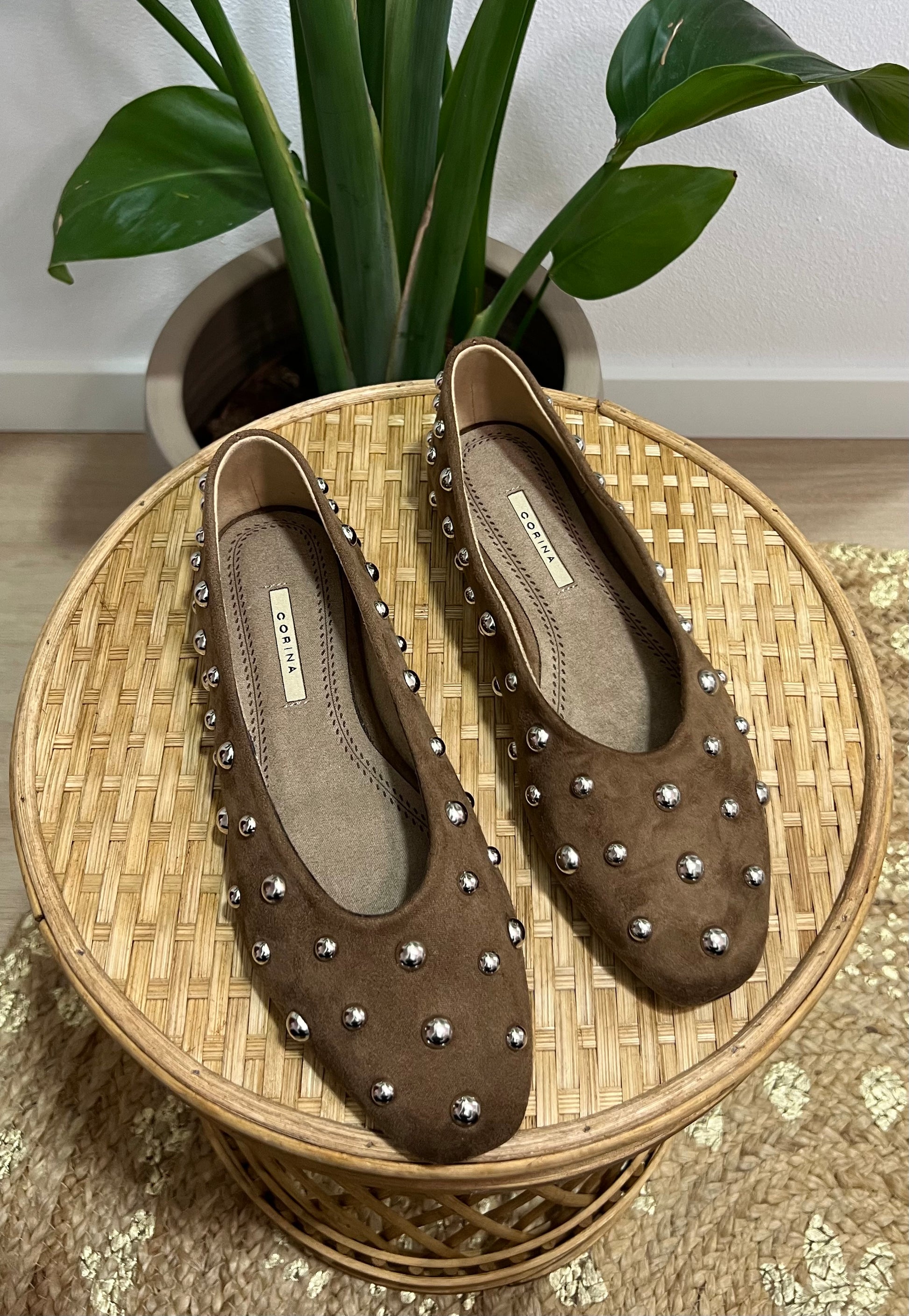 Sabrina plana com palmilha almofadada e ponta redonda. Detalha com tachas redondas prateadas.